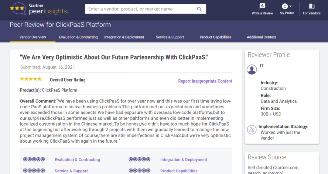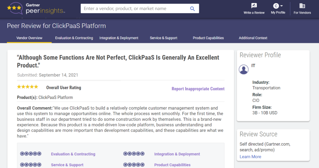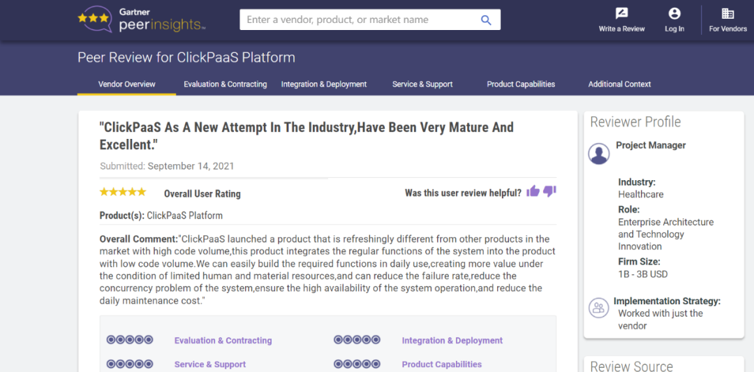 Tips:::【Peer Insights】——用户对企业IT产品和服务发布真实评价的平台。。目前已有355个市场,,255,000条经过验证的评价。。。每一条评价Gartner会针对参评企业营收规模及参评人员信息做验证、、评价内容做多维核实。。。。